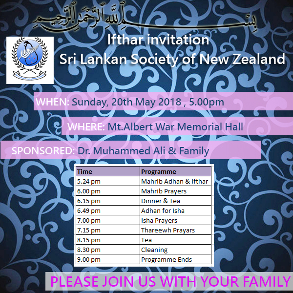 SLSNZ Ifthar & 27th Night of Ramadhan 2018 held at Western Springs Garden hall on 11th June 2018 from Ifthar to till late night prayers. Click here to view event photos Read more... | |